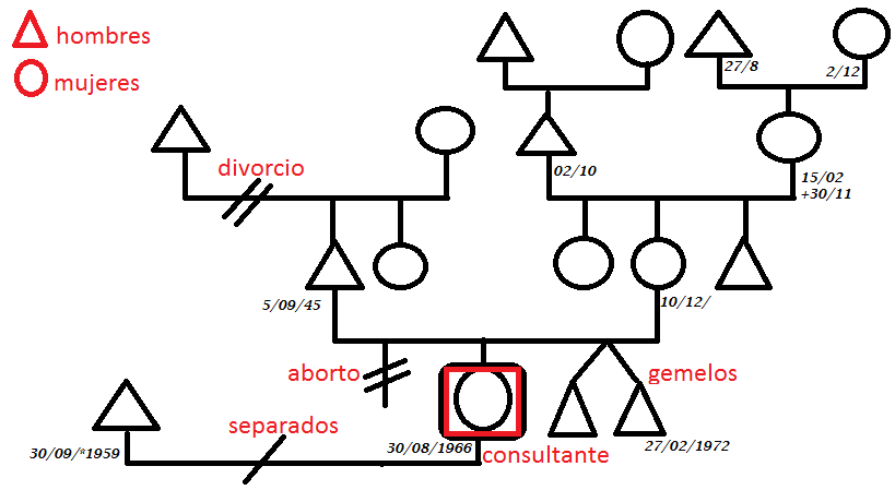 Cada persona deberá aparecer en el árbol en el orden de nacimiento, por lo que si por ejemplo somos 5 hermanos y yo soy la segunda, aparecerá primero a la izquierda el hermano mayor, luego yo y a la derecha los otros hermanos. Los abortos también se colocaran en la posición que les corresponda.